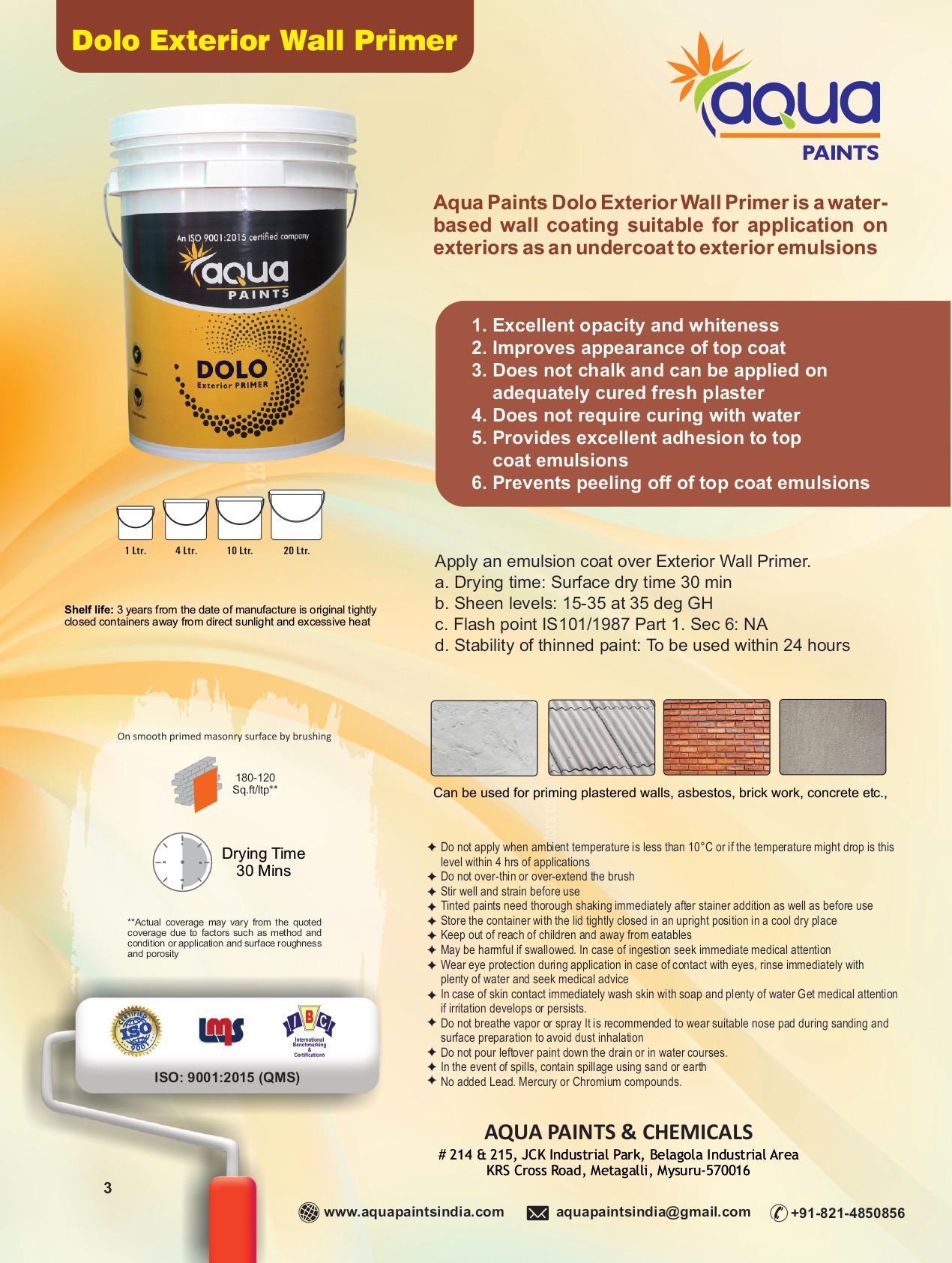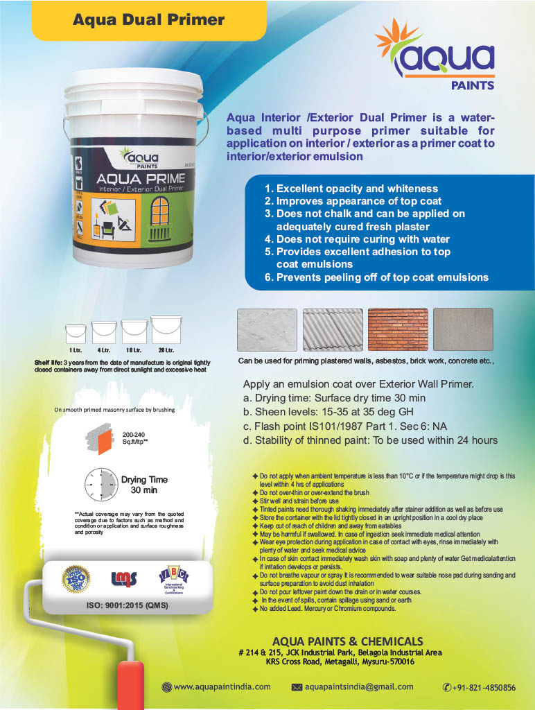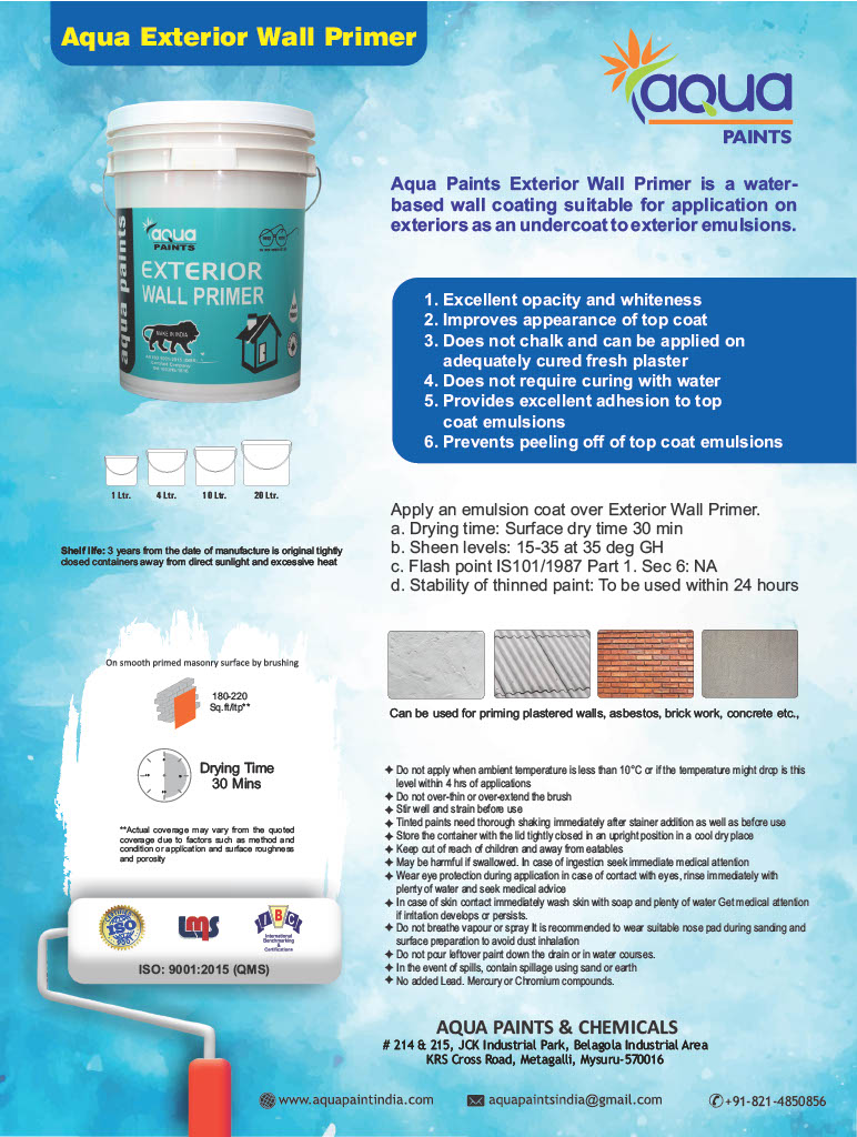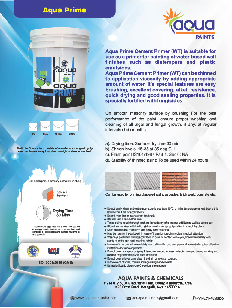 Aqua wall primers provide a smooth and even surface for the paint layer to go on top. Our Primer products provide good adhesion to concrete substrate below and are a value for money product. It also improves the durability and longevity of the paint coat applied above it.