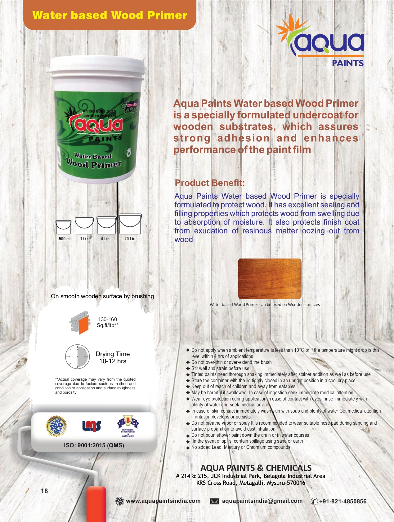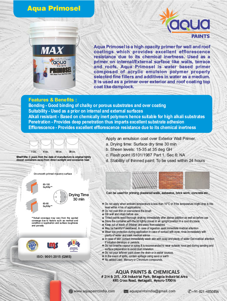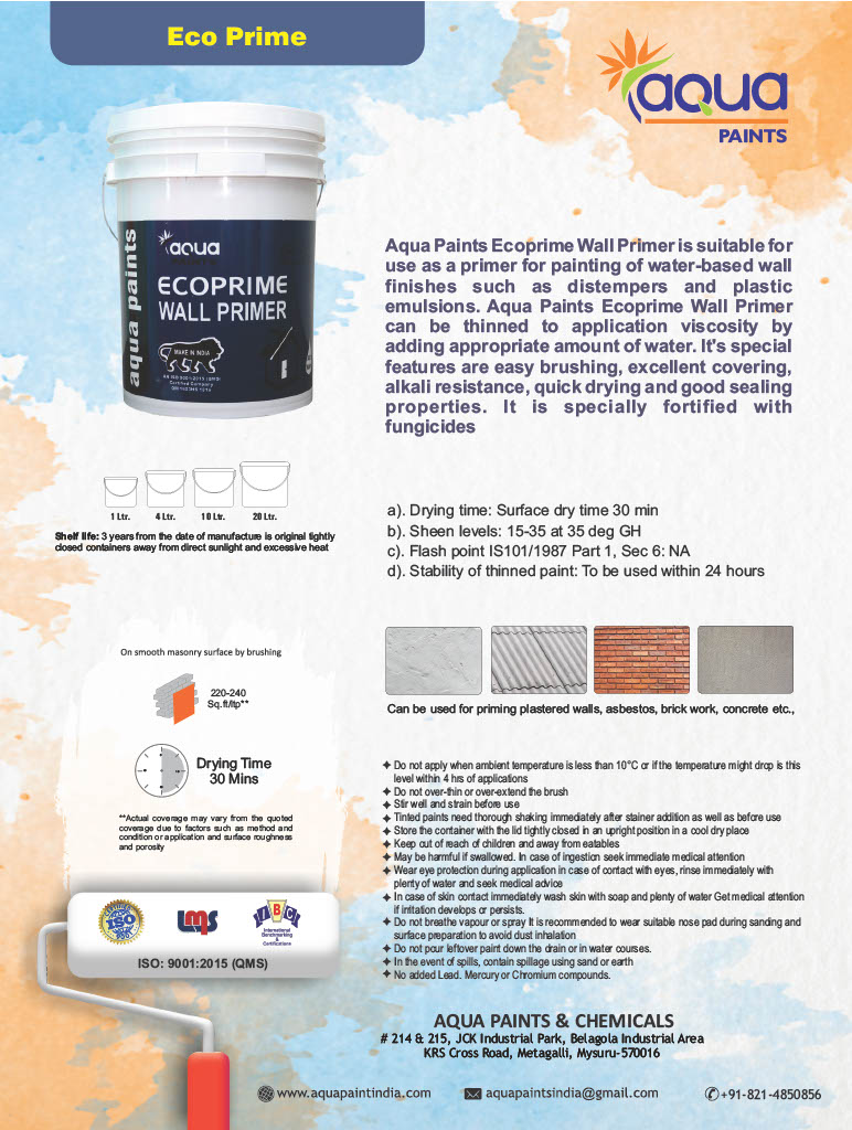 Aqua wall primers provide a smooth and even surface for the paint layer to go on top. Our Primer products provide good adhesion to concrete substrate below and are a value for money product. It also improves the durability and longevity of the paint coat applied above it.