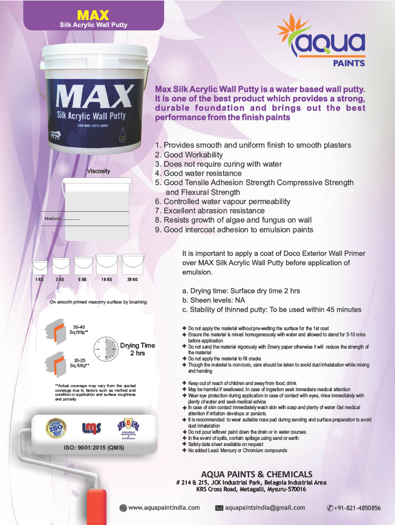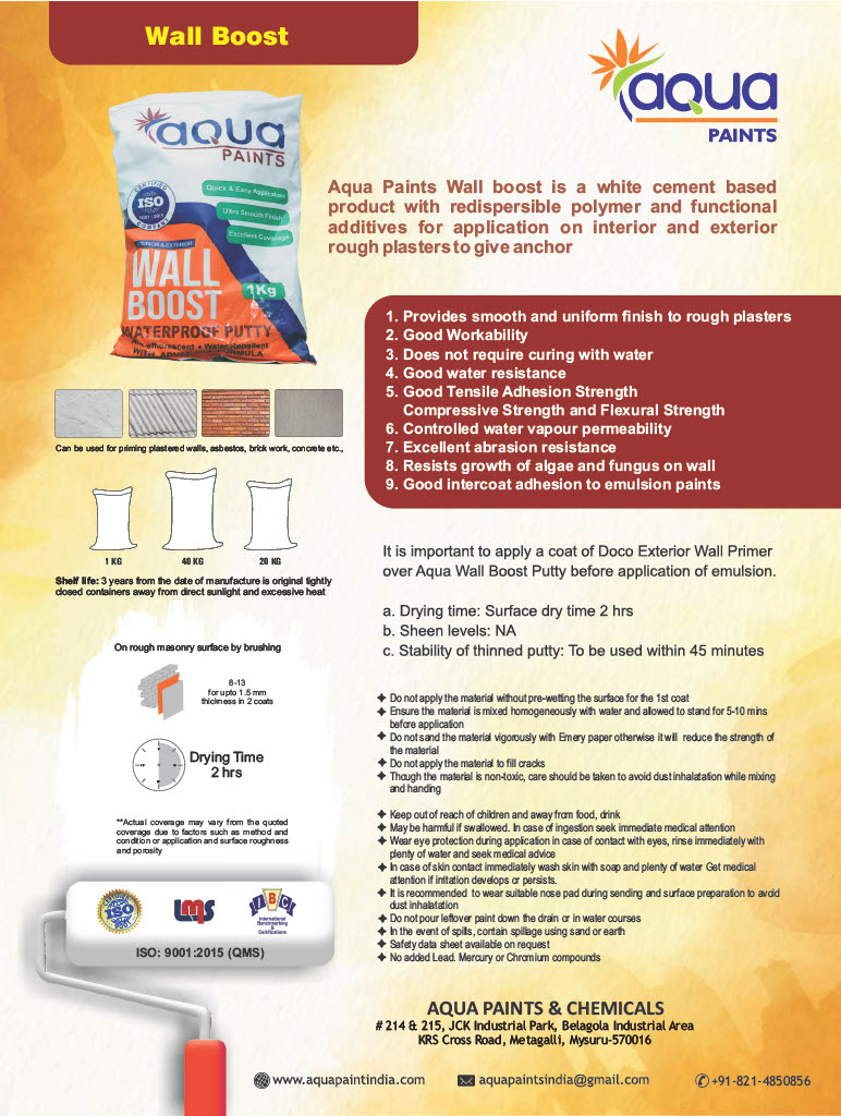 Aqua Paints wall putty helps in hiding wall imperfections and provide smooth surface for the top coats